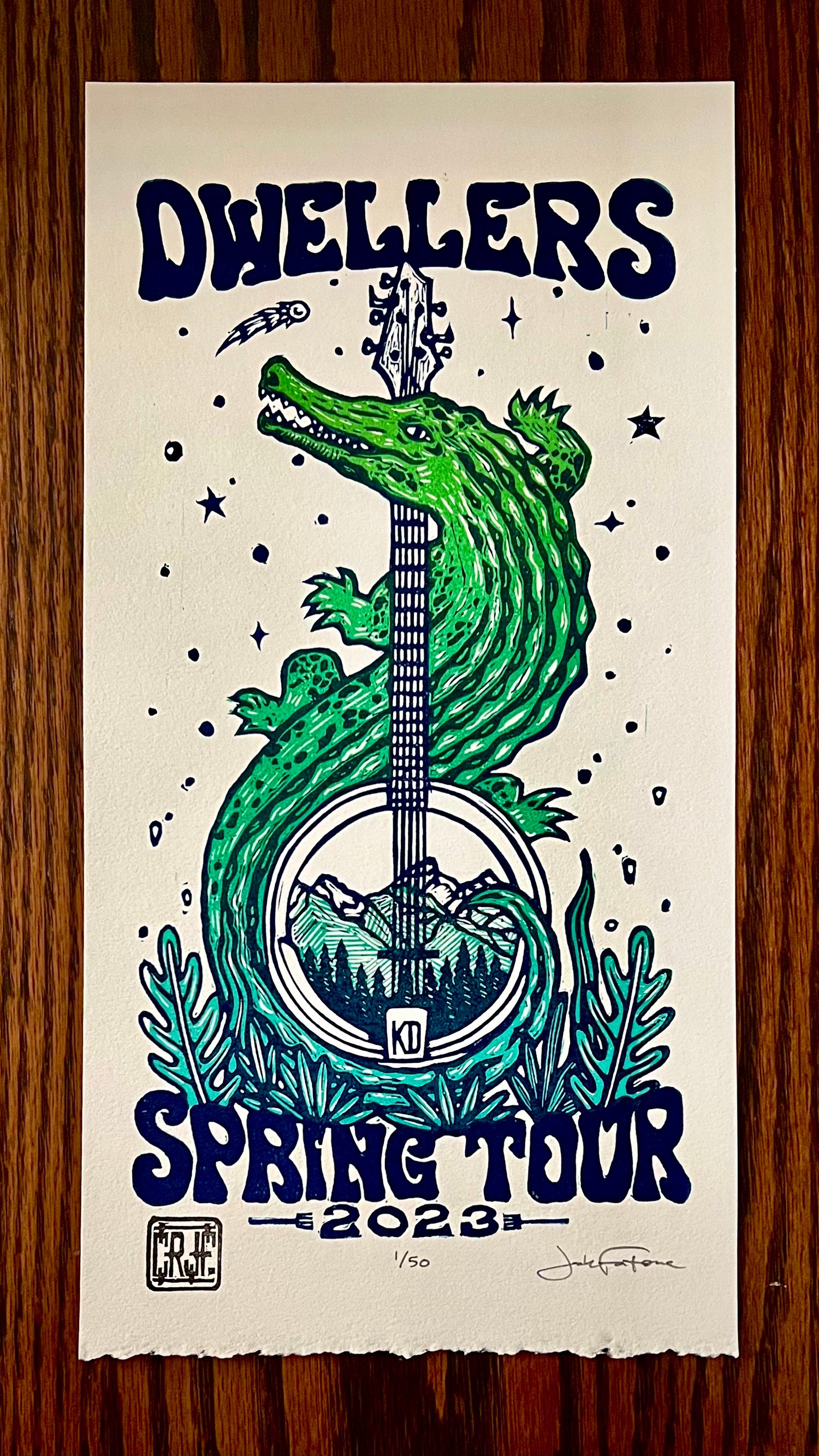 New block print created to commemorate the Kitchen Dwellers' 2023 spring tour. This piece is a collaboration with friend and artist, Christopher Robertson.