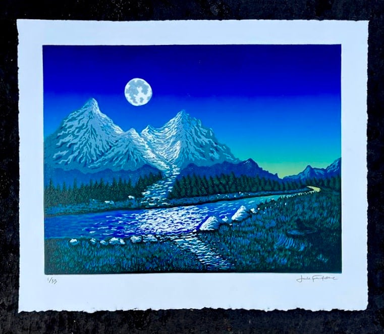 This 8-layer single-block reduction print represents my most time-consuming and complex work to date. The design is inspired by the many moonlit nights I spent staring at the sky as the moon rose over the mountains of Summit county, Colorado, as well as the imagery provided within these lyrics from "Love and Regret" by Billy Strings: